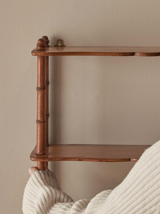 Victorian mahogany bobbin shelving unit on ceramic castors