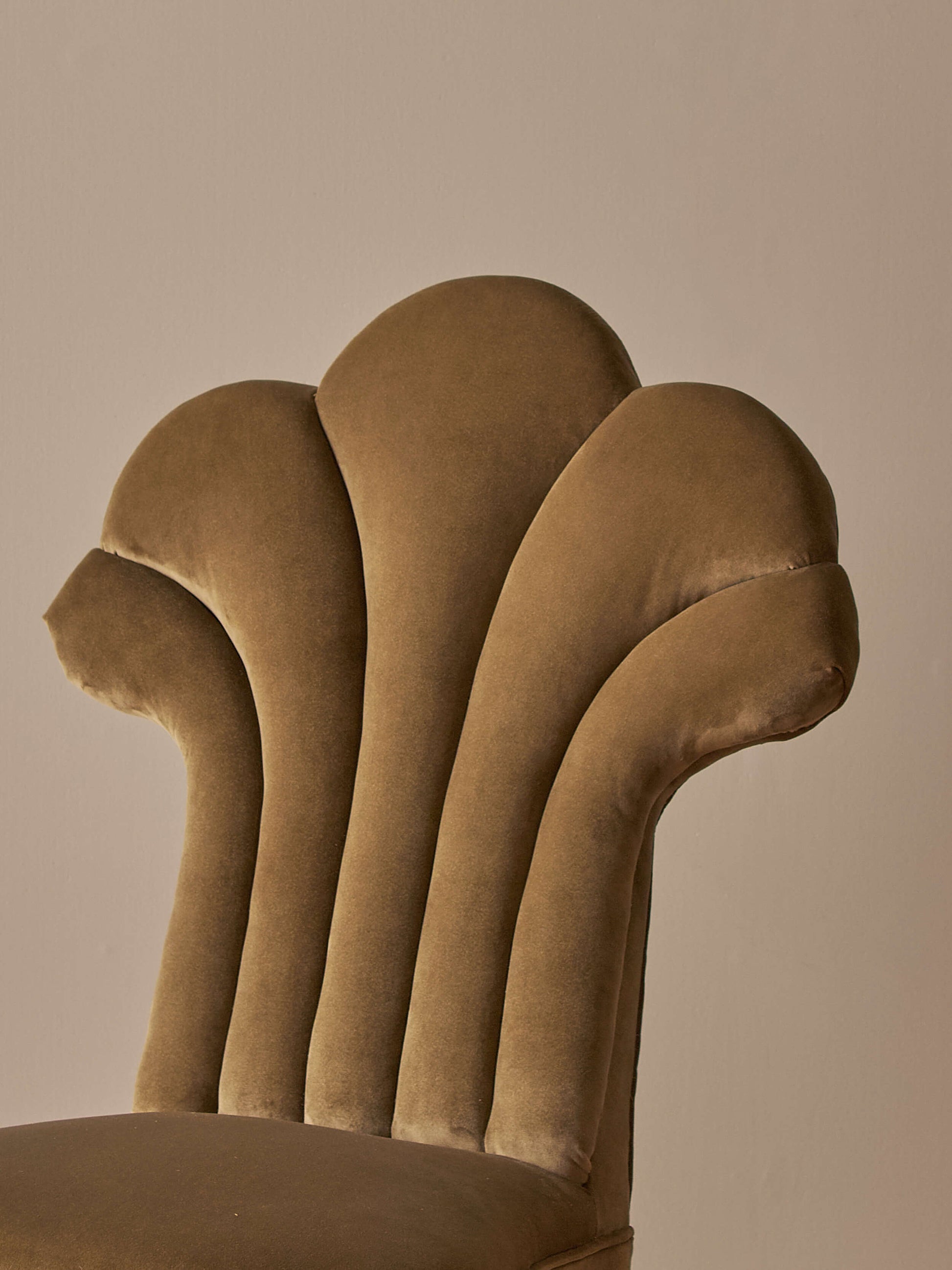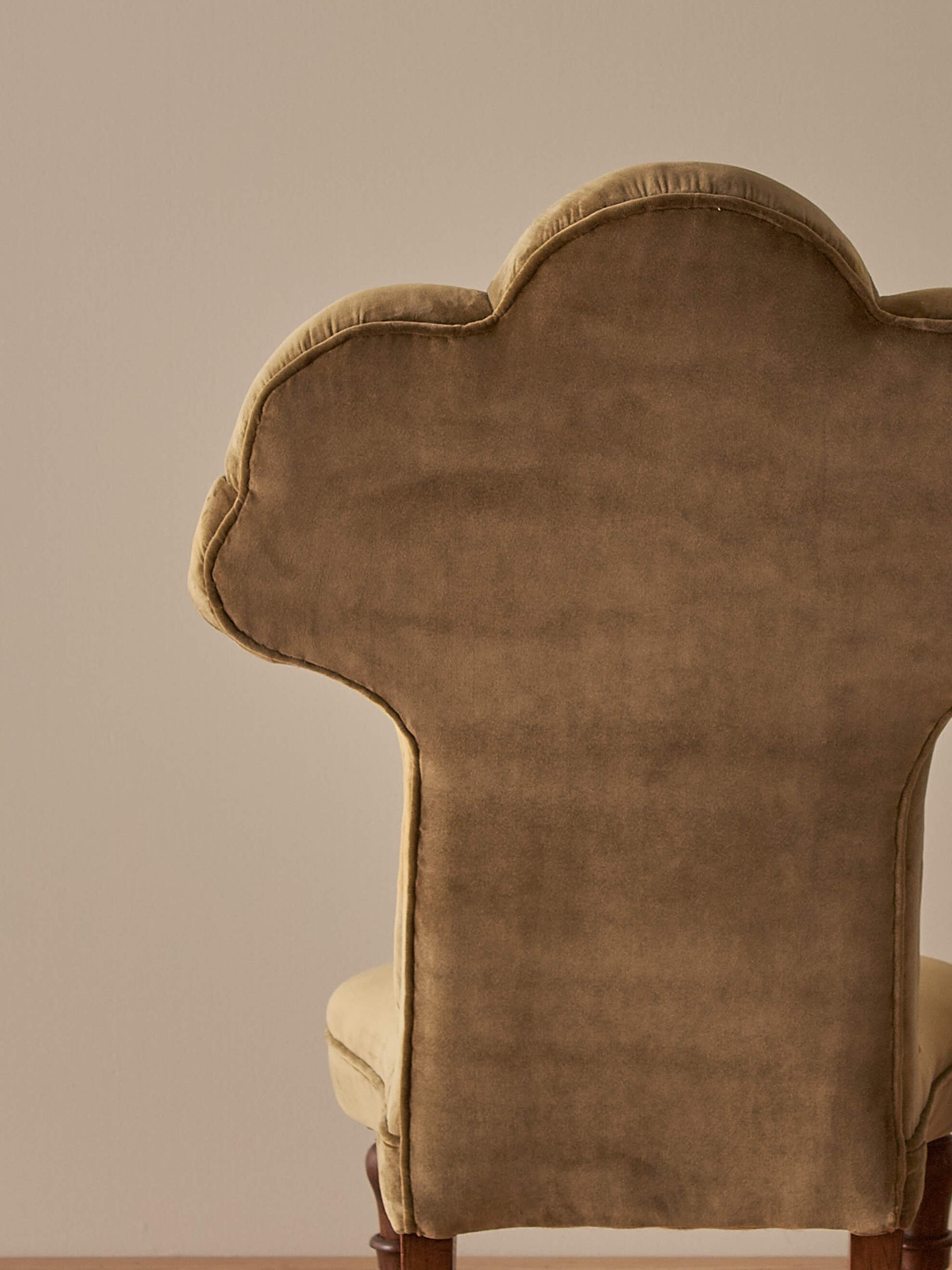 Expertly reupholstered using traditional materials and methods, and recovered in a soft olive-green Linwood velvet.