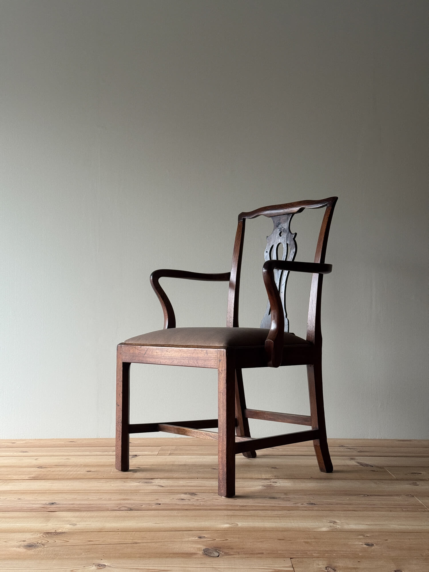An elegant Georgian mahogany armchair with upholstered seat. Estimated to be 1700s.