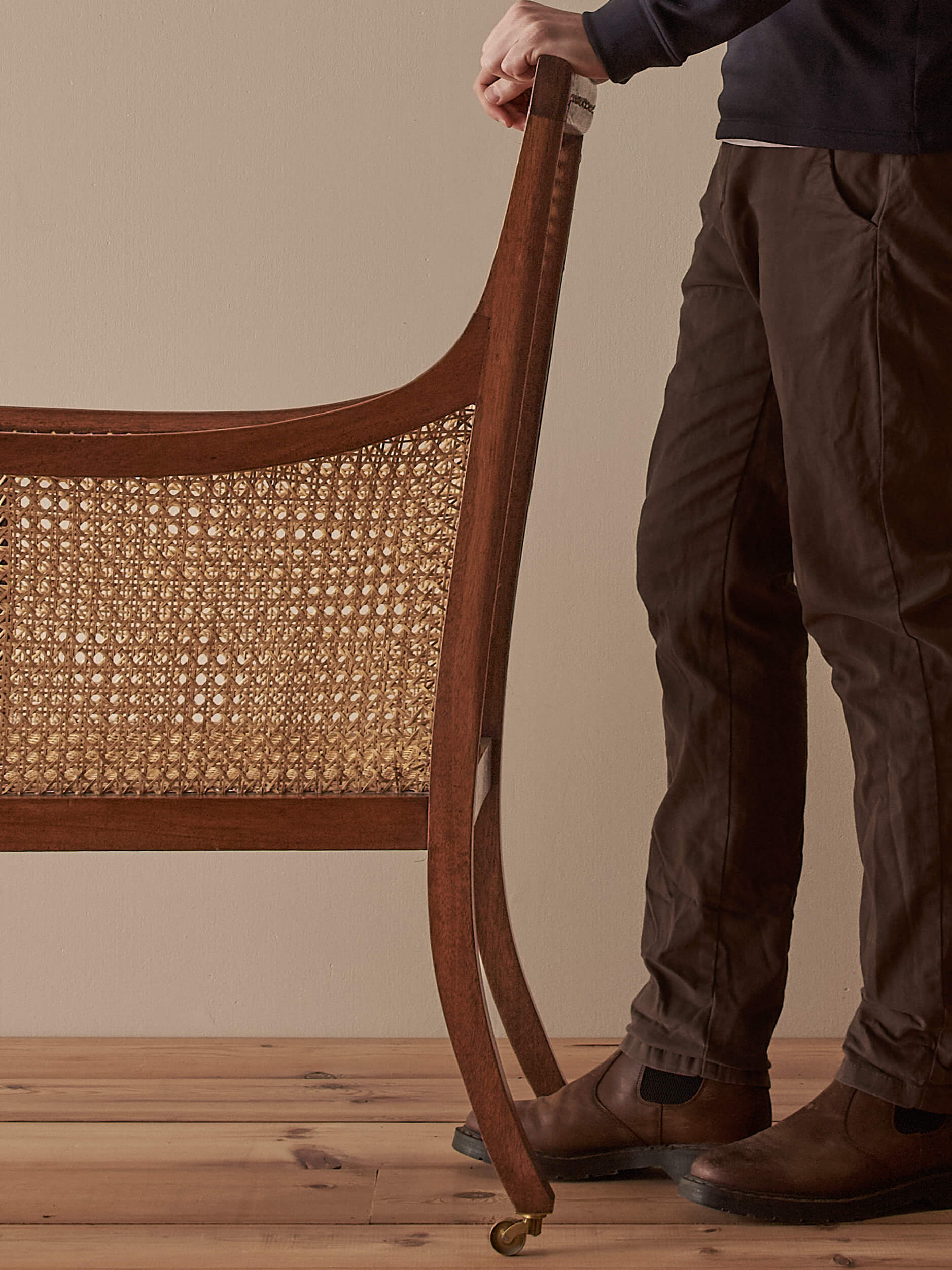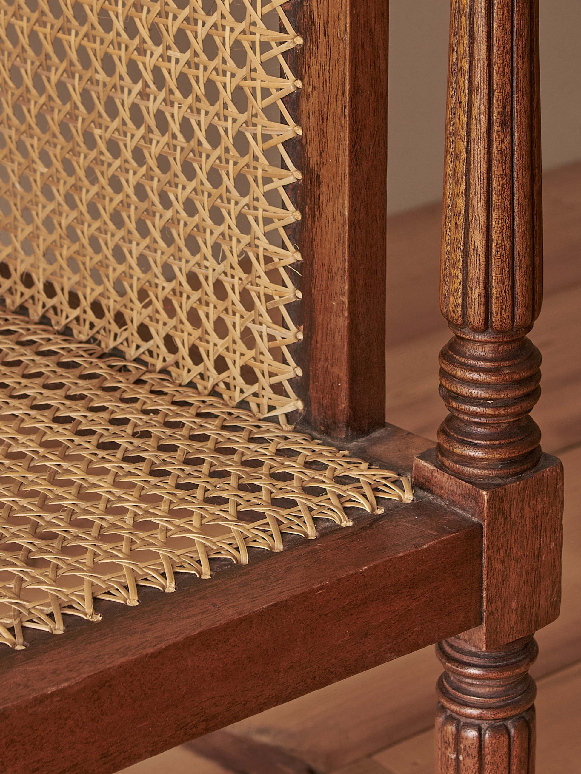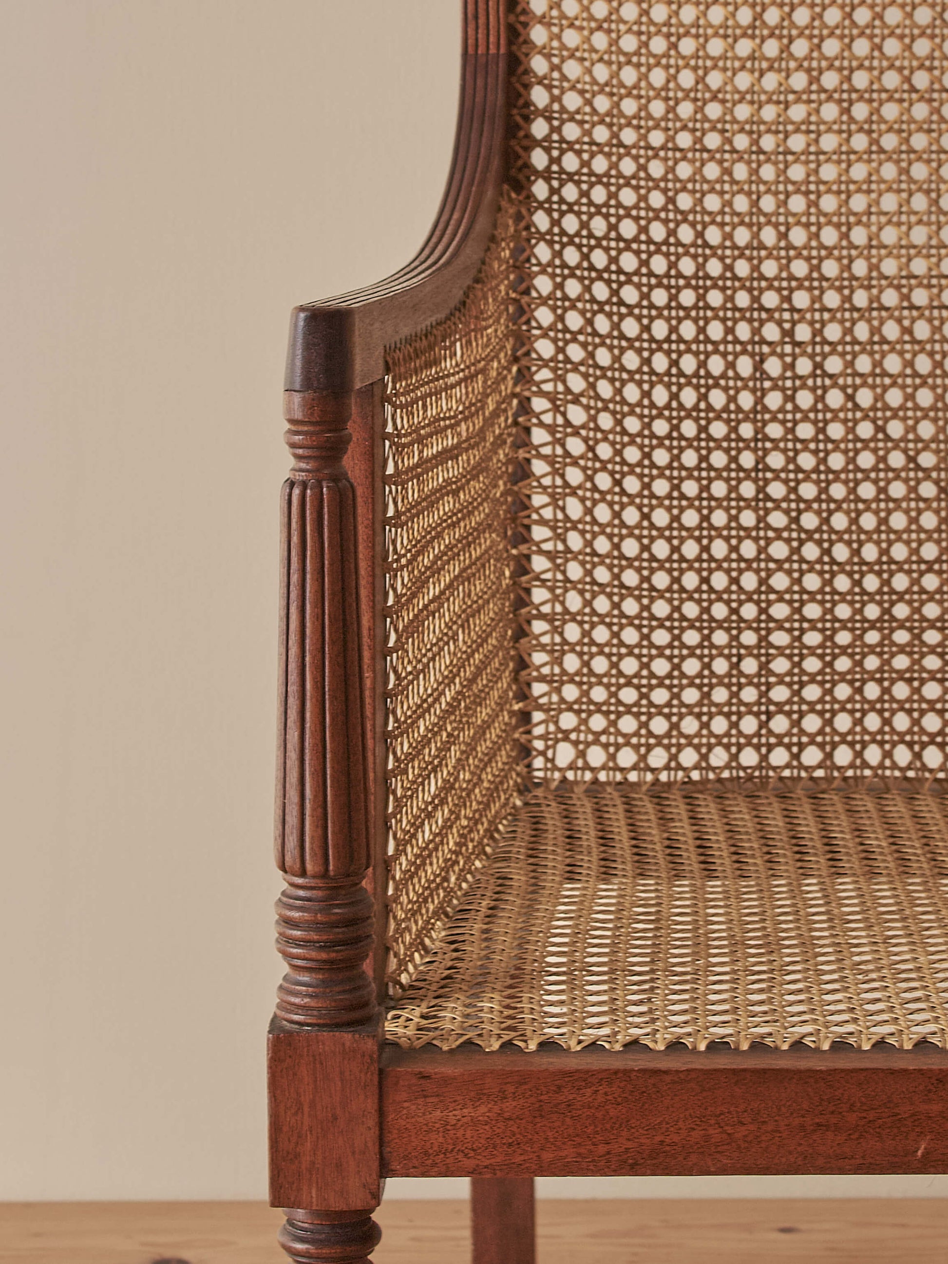 A lovely pair of antique bergère chairs raised on brass castors. Estimated to be early 1900s.