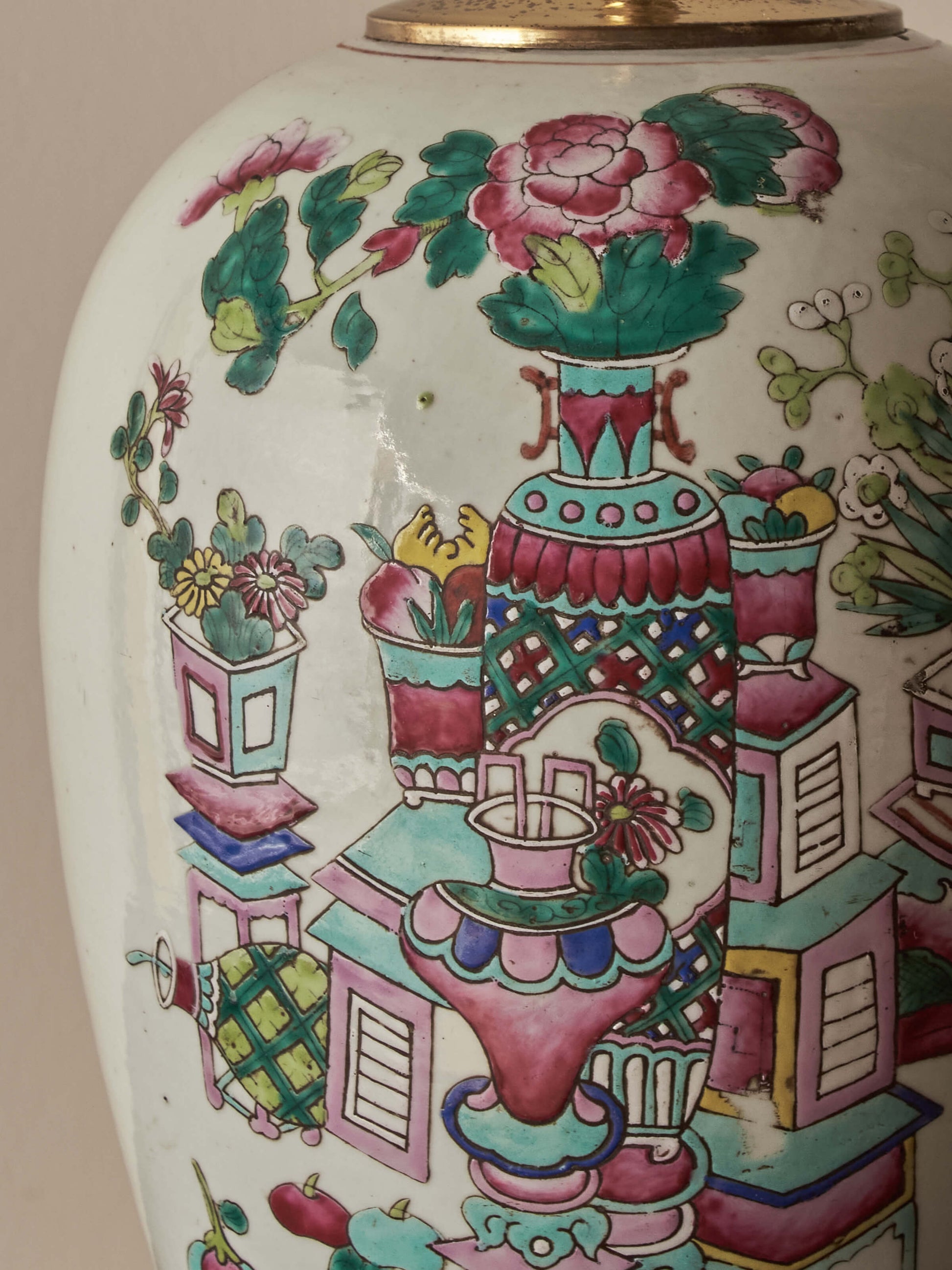 Recently rewired with a bronze twisted cable. There are some age-related marks and patination to the brass, and some slight colour variations to the bases and motifs (please see photographs for details).