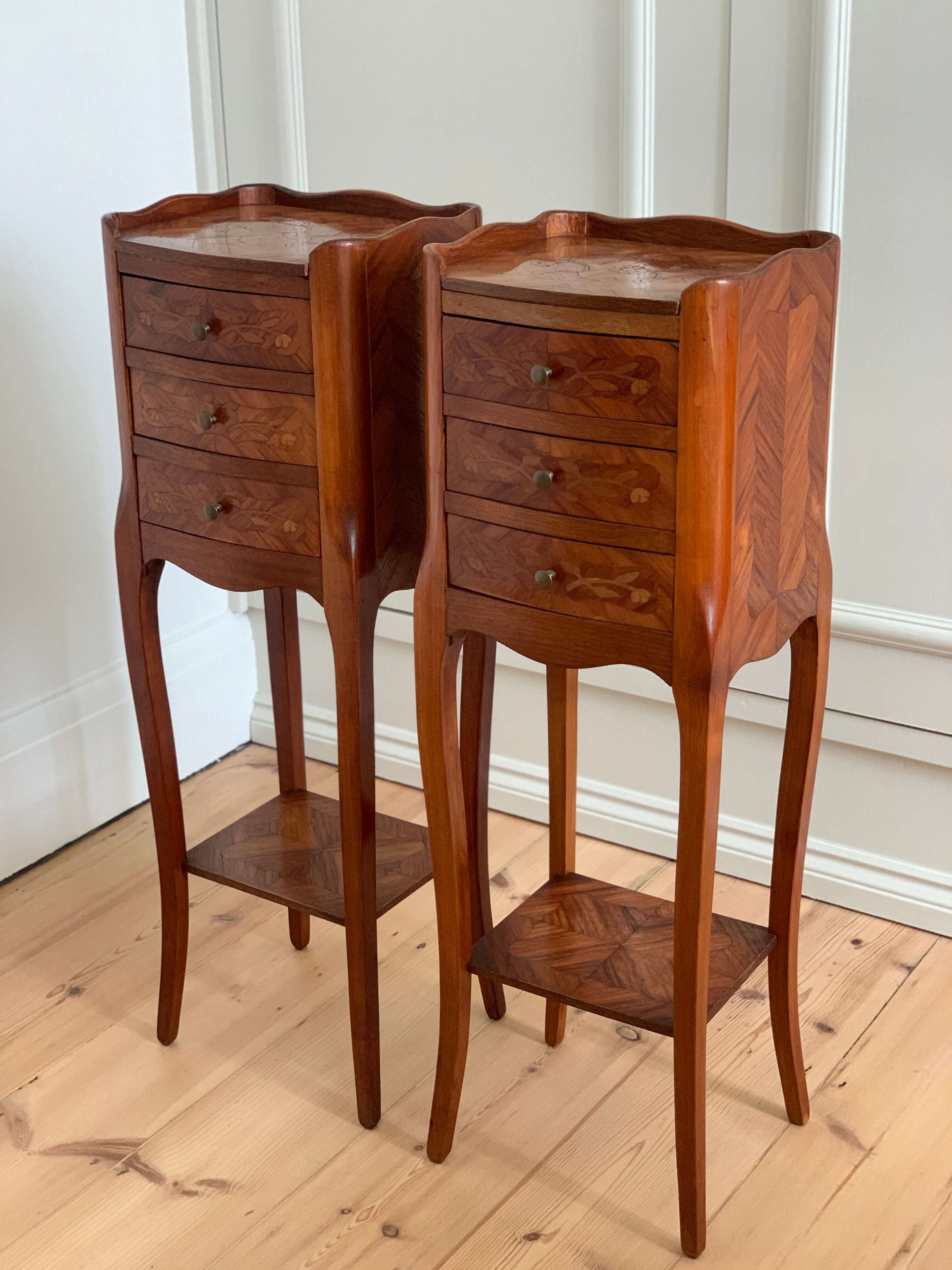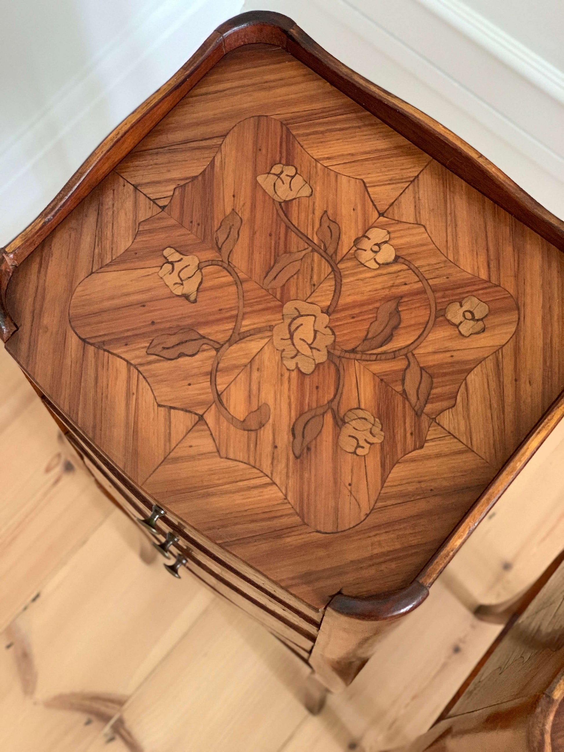 An elegant pair of French antique marquetry petite bedside tables. Estimated to be early 20th century.