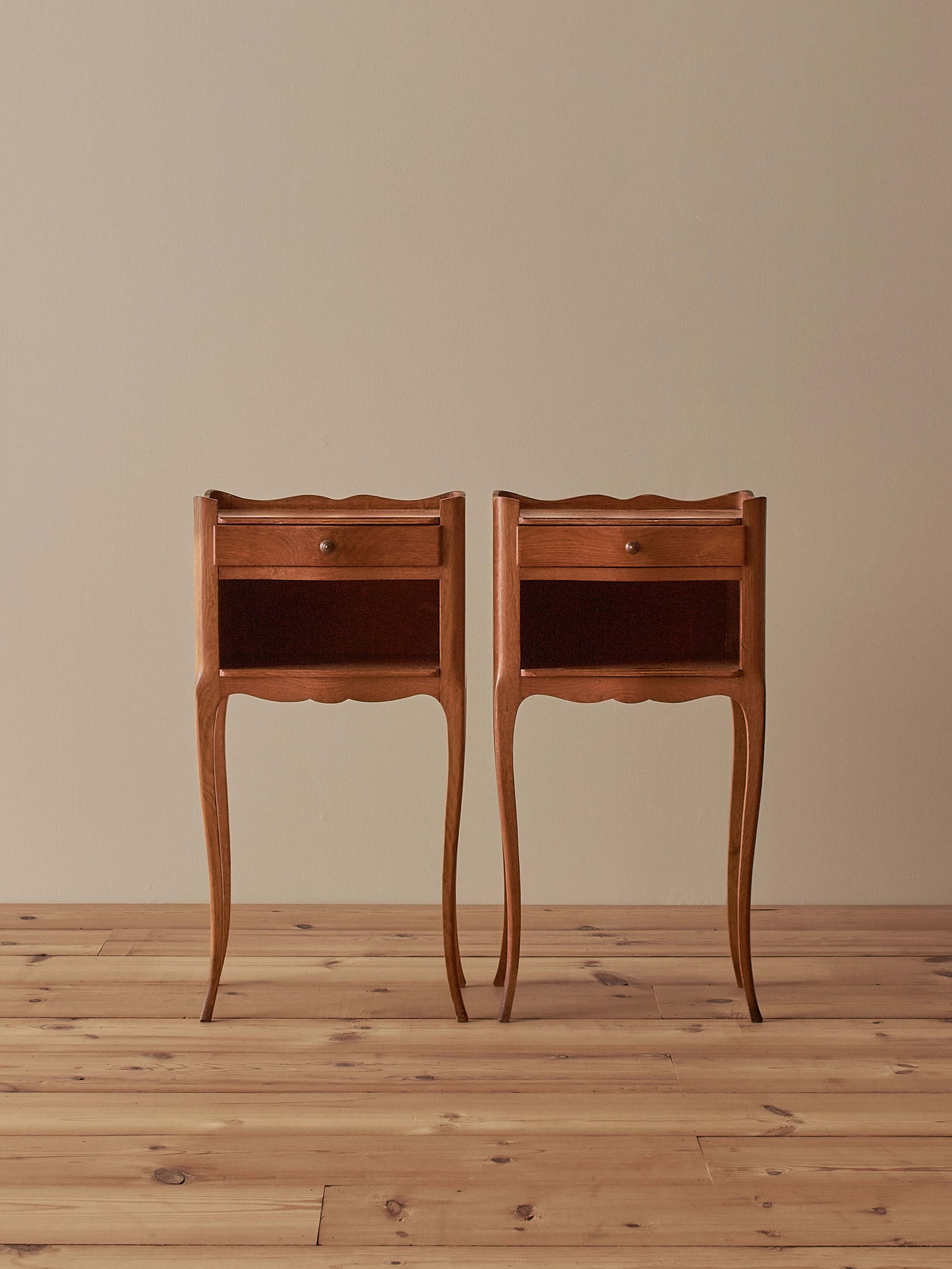An elegant pair of French light oak vintage bedside tables. Estimated to be mid-late 1900s.