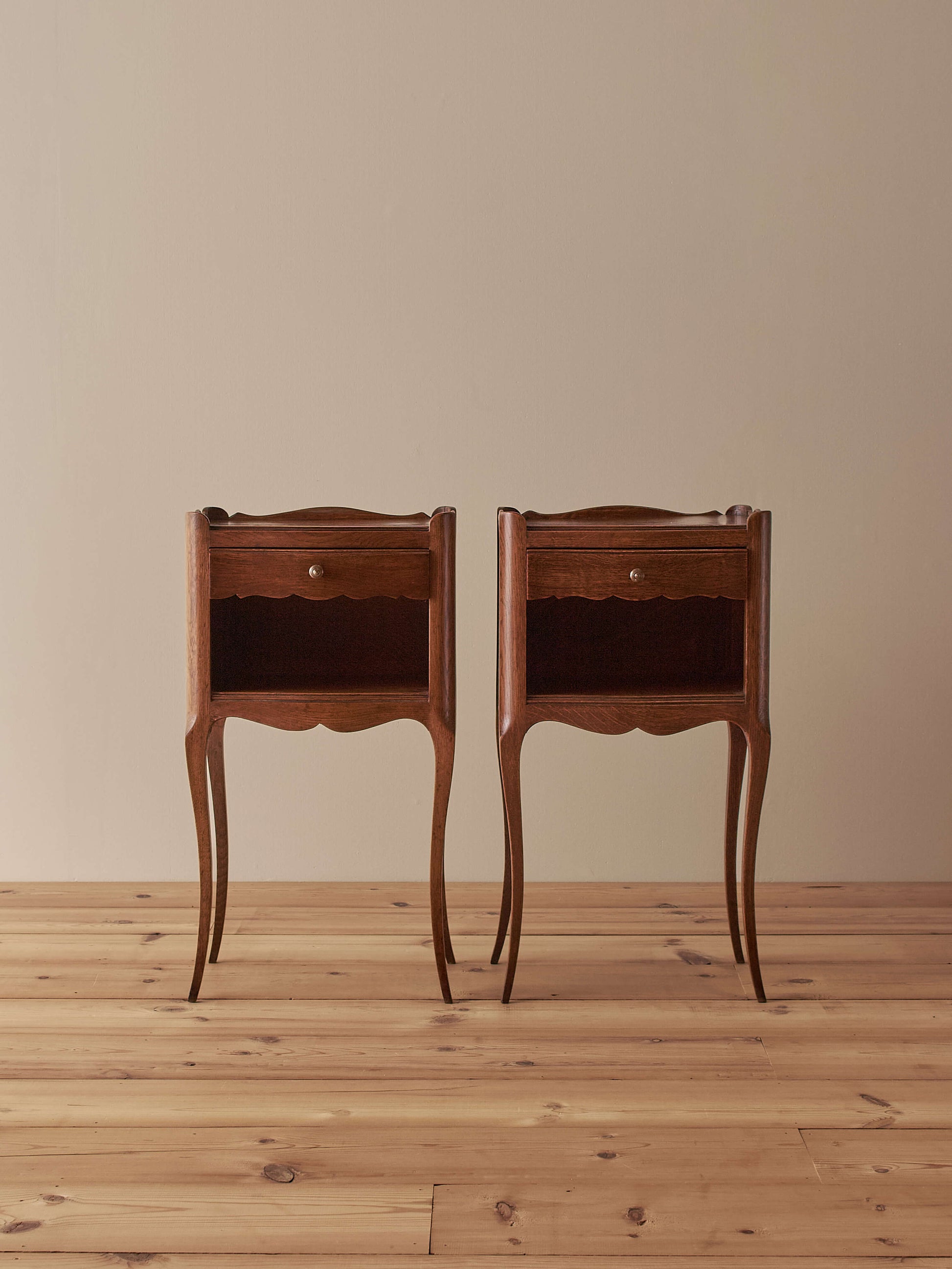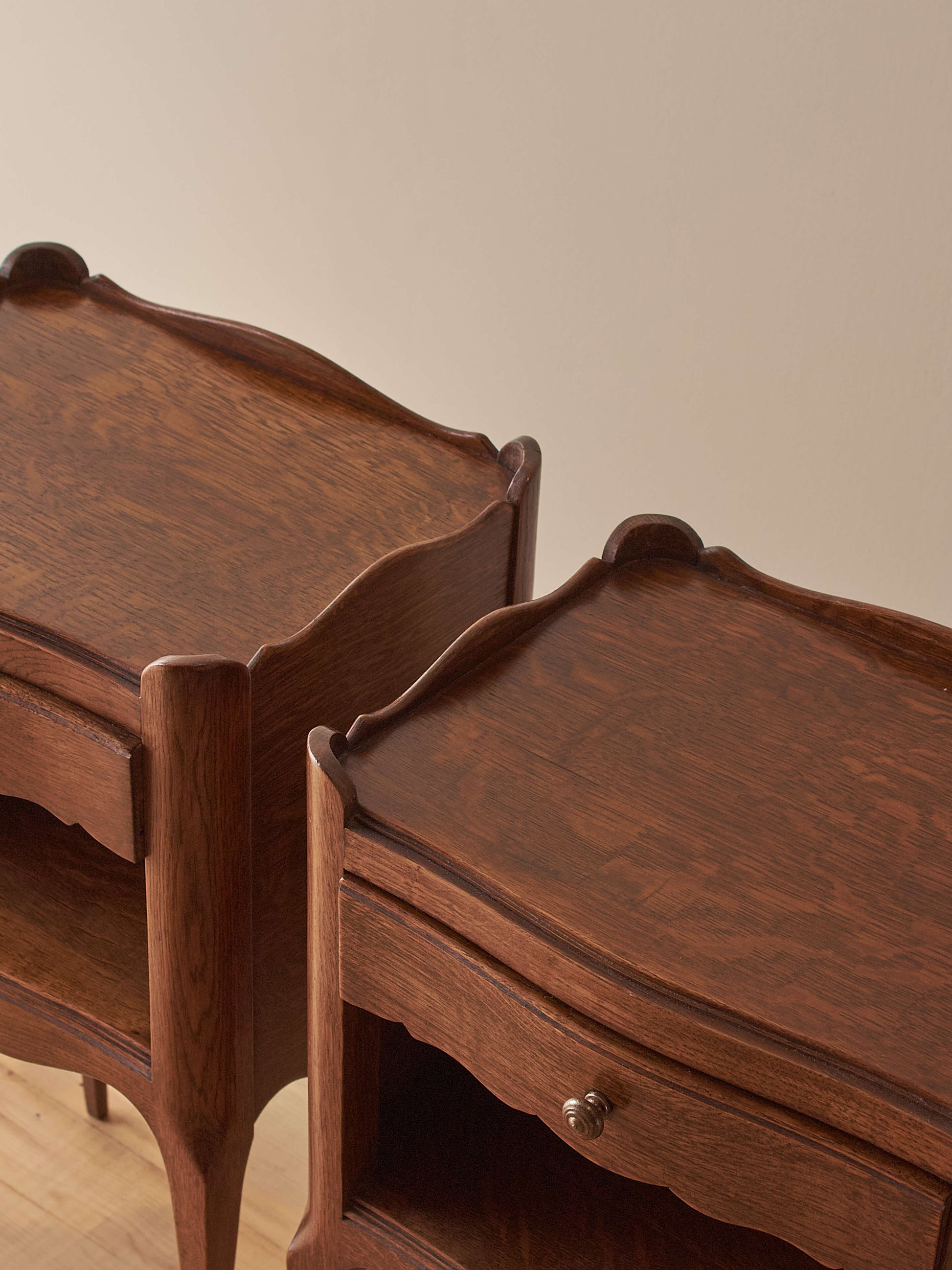 A charming pair of French oak vintage bedside tables. Estimated to be mid 1900s.