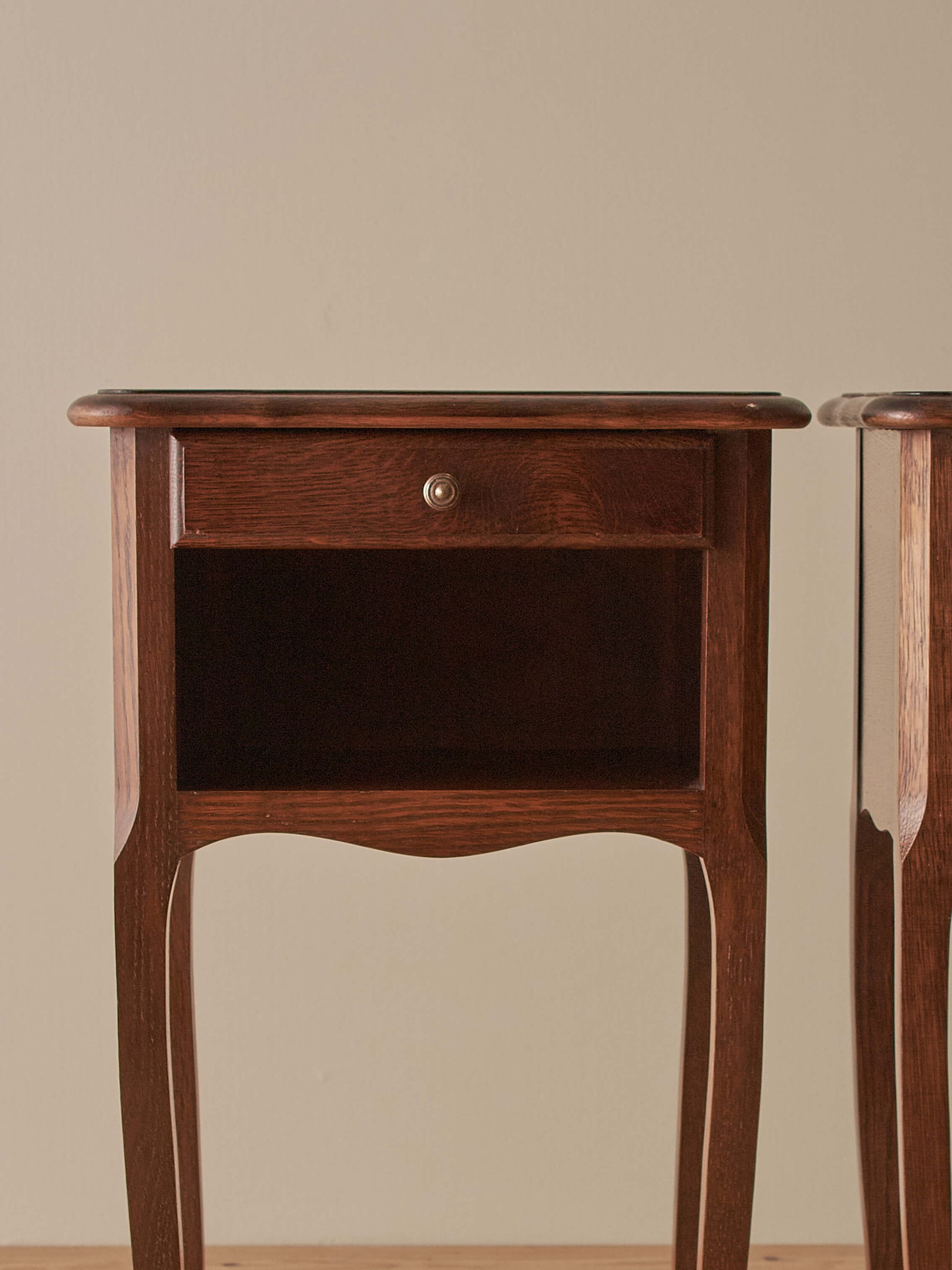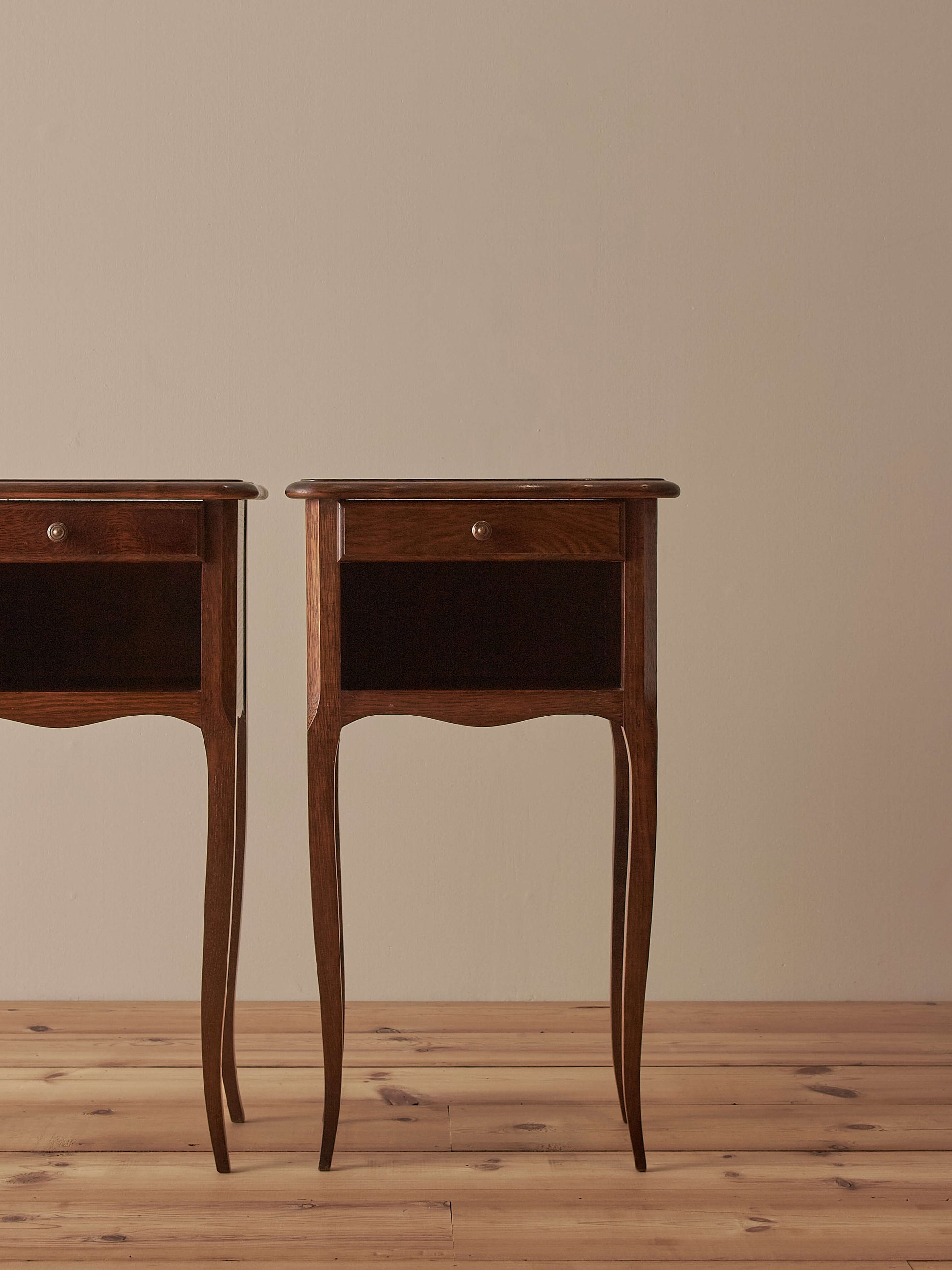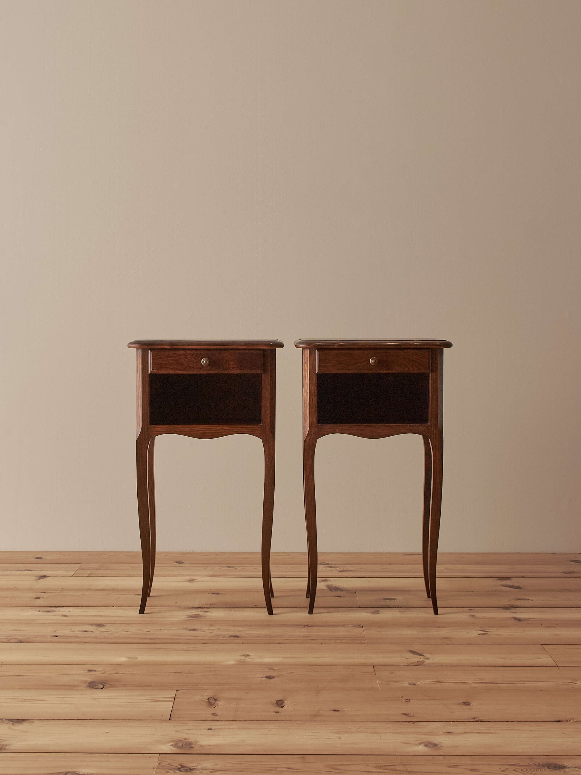 A lovely pair of French vintage bedside tables with single drawers. Estimated to be mid-late 1900s.