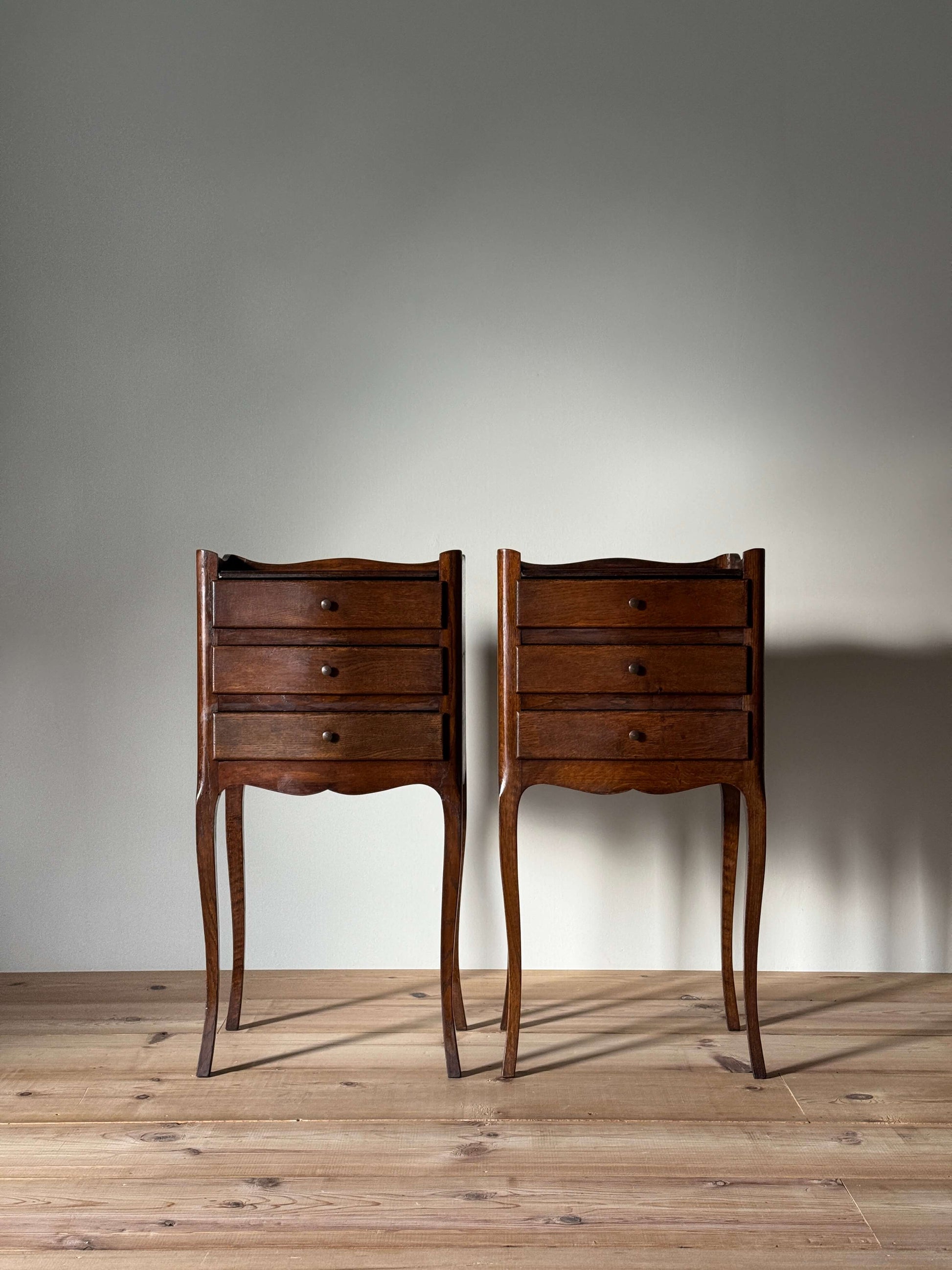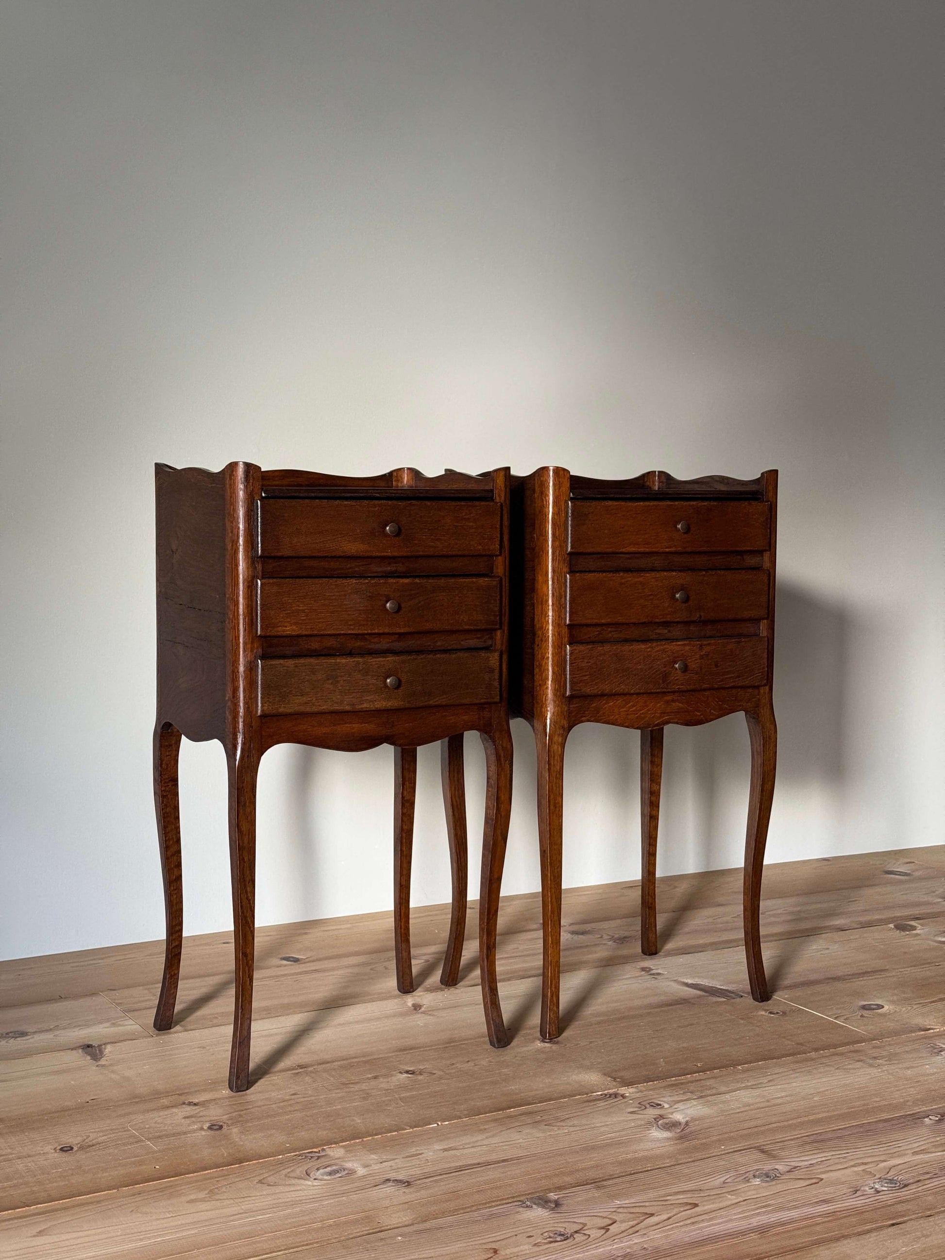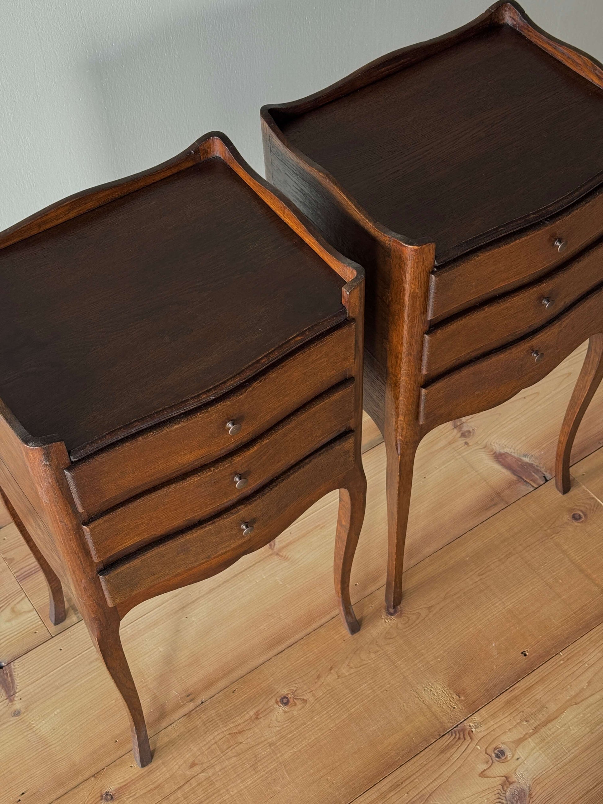 A pair of French vintage bedside tables with three drawers. Estimated to be mid 20th century.
