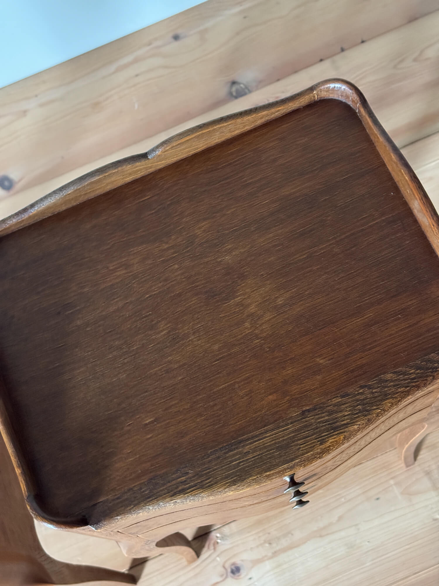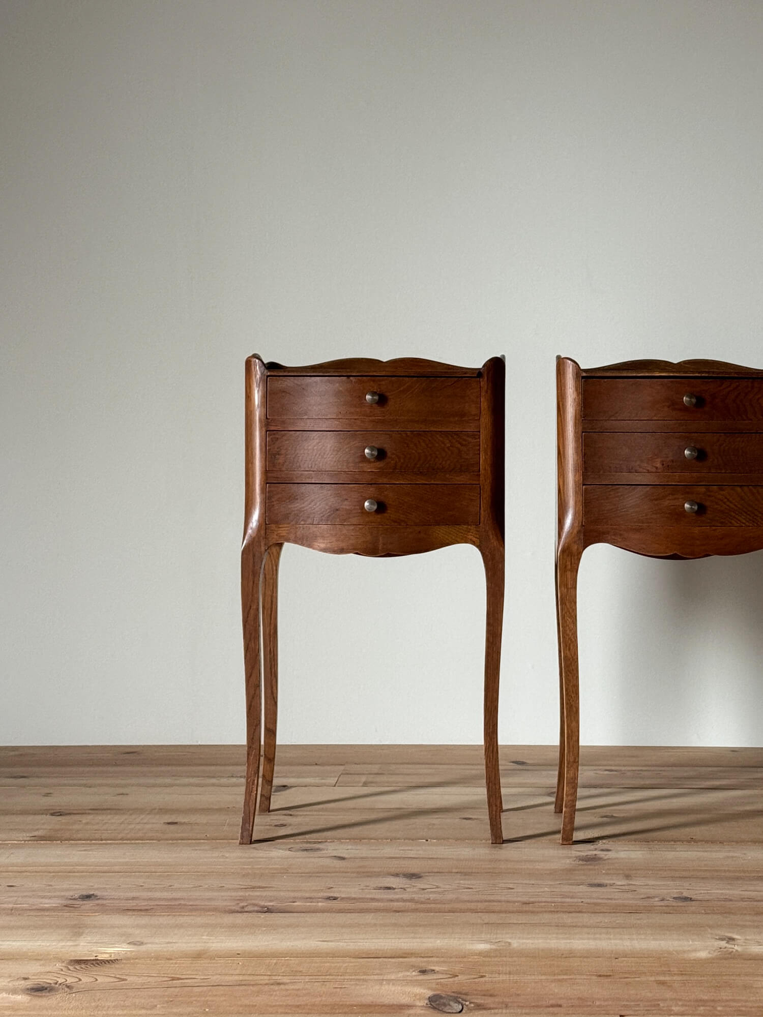 A beautiful pair of French vintage bedside tables with three drawers. Estimated to be mid 1900s.