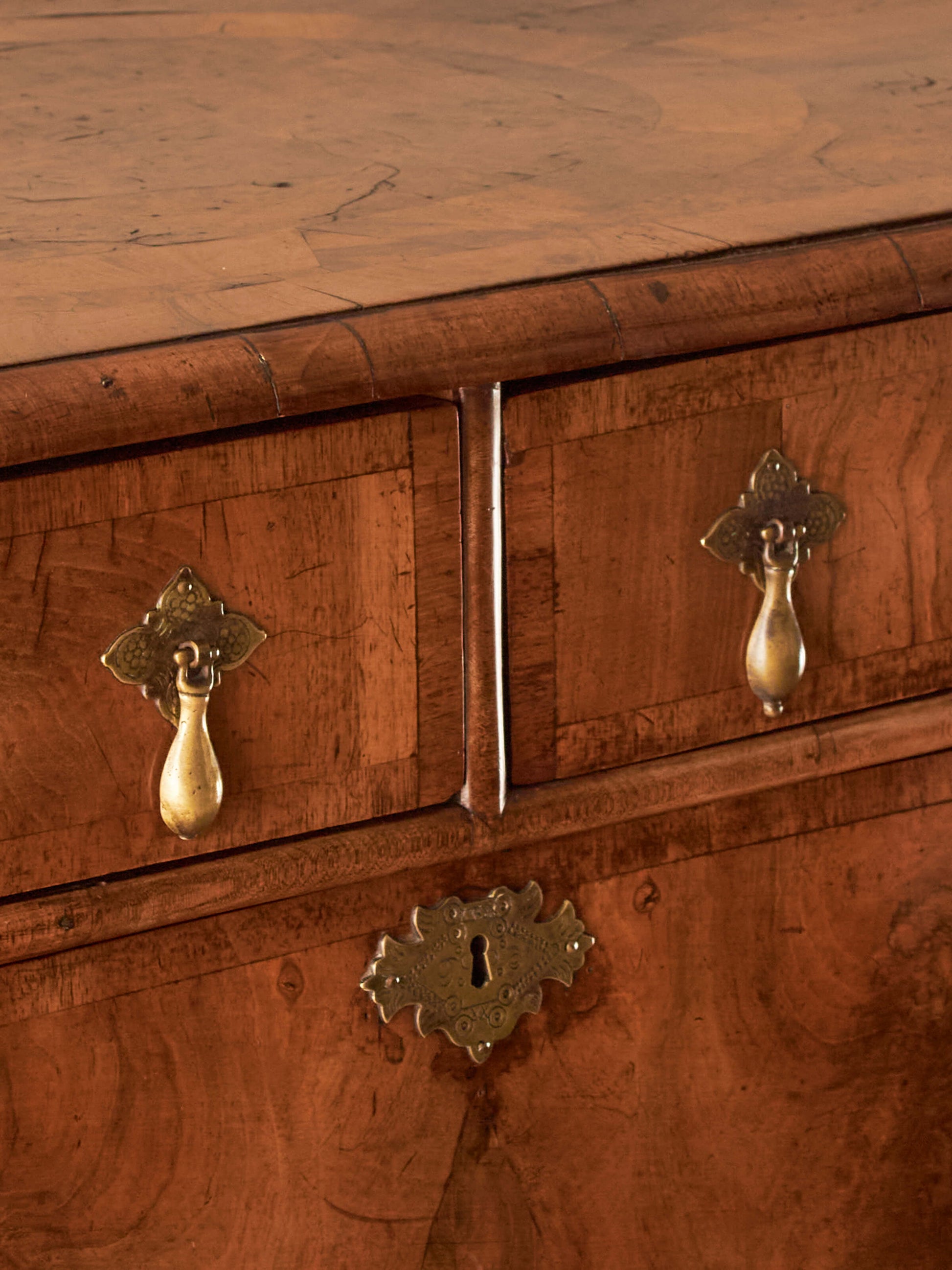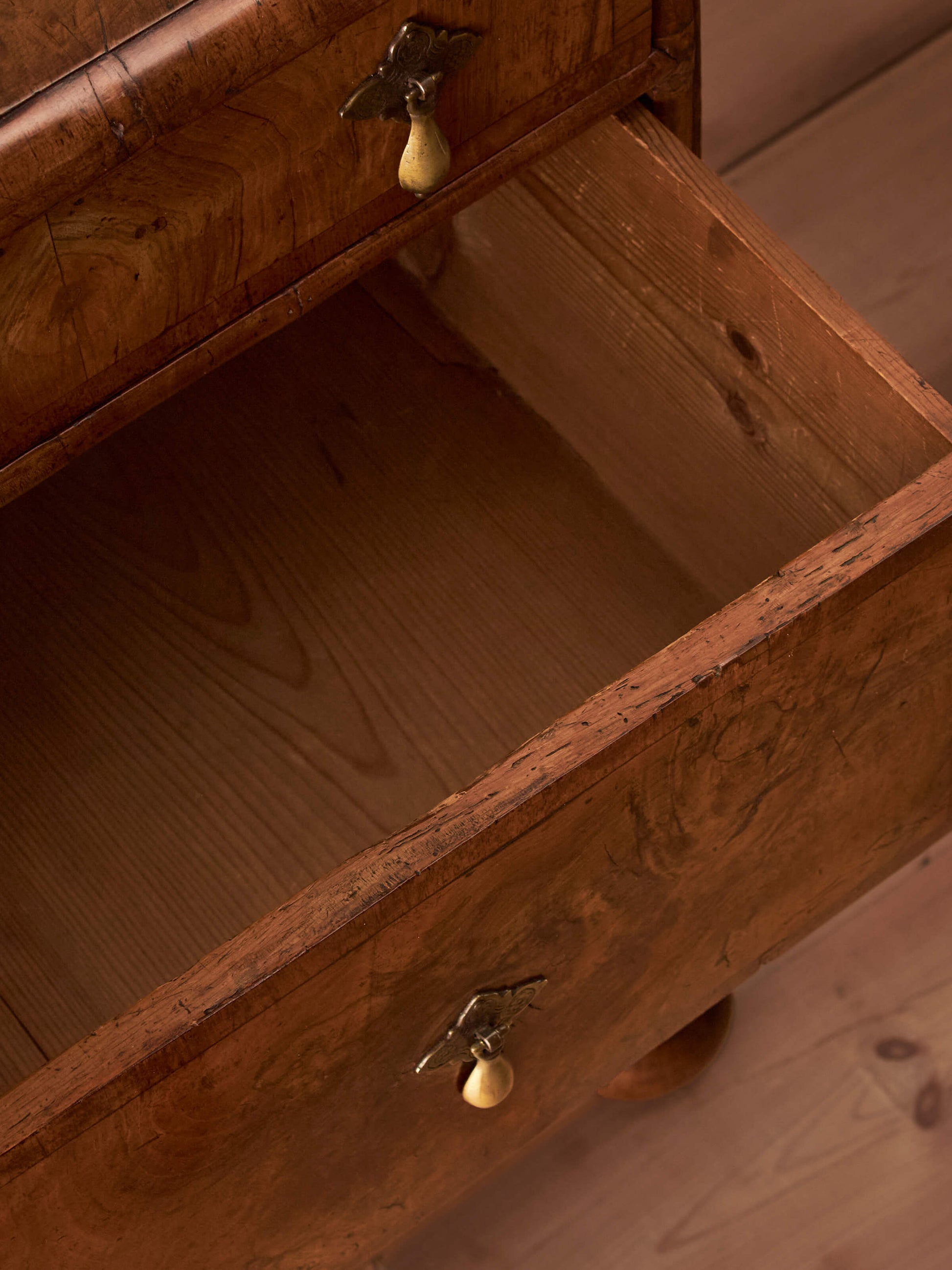 A beautiful Queen Anne walnut chest of drawers raised on bun feet. Estimated to be early 1700s.
